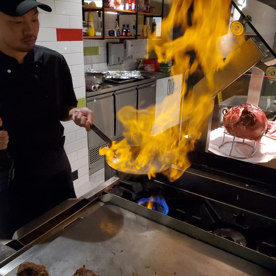 - Tasty morsels cooked on the grill plate before your eyes