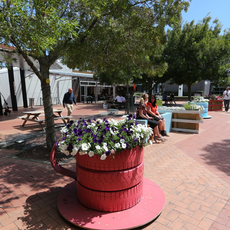 In keeping with the mountain theme the landscaping incorporates alpine planting. The paving has also been upgraded, with specimen trees and the existing gardens and lawn area revamped to create an informal enclosed space in the centre of the business district.