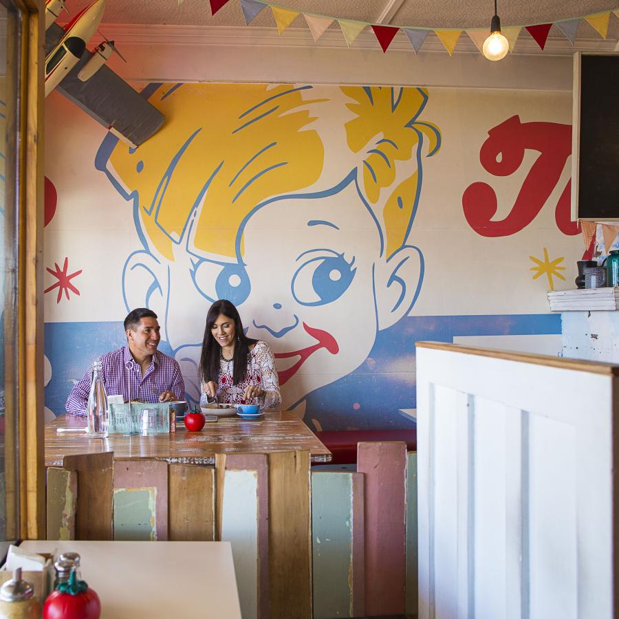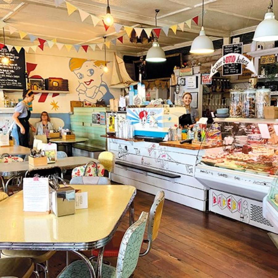 Come and sit inside at one of the quirky 50s-styled tables and chairs or on a nice day sit outside under our floral umbrellas, you know the ones, forever chasing them down the beach.