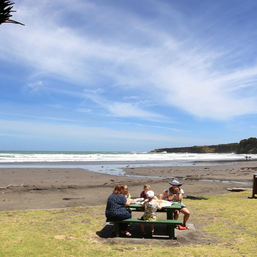 Opunake Beach Kiwi Holiday Park is an ideal family park, offering a unique beachfront location on a safe surf patrolled beach (over summer) in a sheltered sandy bay. Opunake beach is only one of the beaches on Surf Highway that offer great fishing & surfing. There is a children's play area with toddler’s paddling pool, ample seating, picnic tables and BBQ's. The Opunake Loop Trail & lake are nearby, with stunning views of Mt Taranaki and the coastline, only minutes from Opunake's 18 hole golf course.